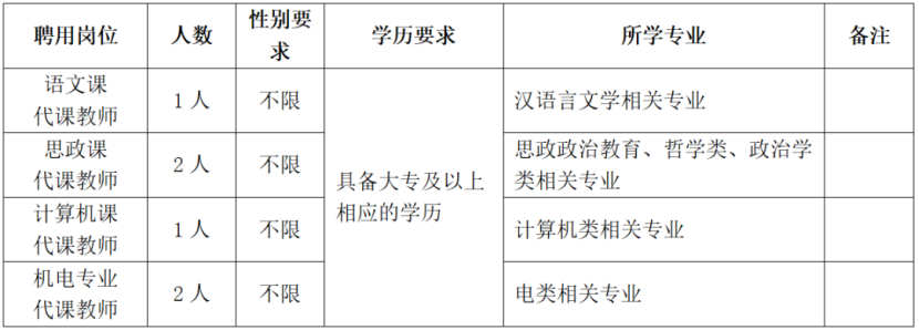 为保障学校正常教学工作开展,缓解我校教师不足问题,经学校研究,现面向社会聘用语文、思政、计算机、机电专业代课教师6人。现将有关事项公告如下。