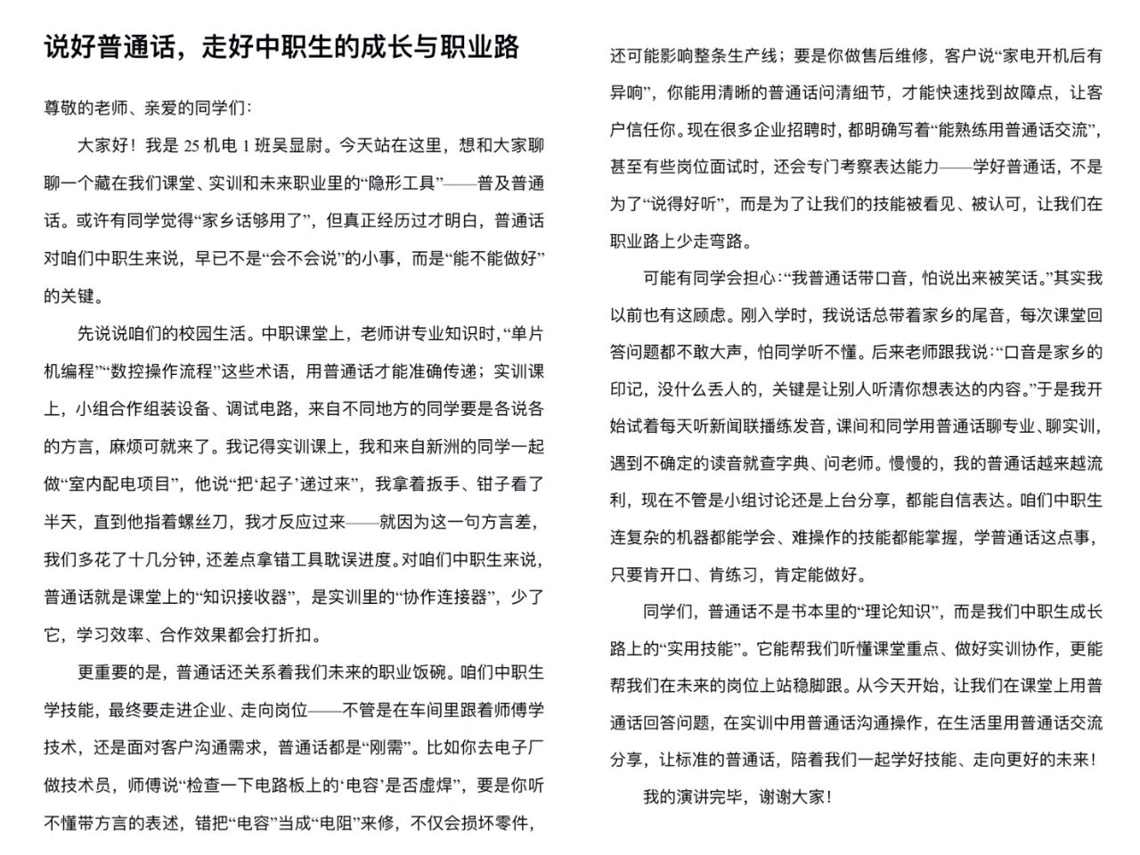 9月15日上午,伴随着庄严的周一升旗仪式,25机电1班学生吴显尉作为学生代表,在国旗下发表了以“推广普通话”为主题的讲话。此次讲话,正式拉开了我校第28届推普周系列活动的序幕。