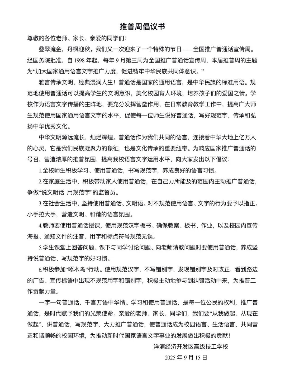 此外,学校还创新宣传形式,多维度开展系列活动:充分利用大课间广播时段,循环播报普通话推广知识与相关政策;在校内教学楼显著位置设置推普宣传专栏,以图文并茂的形式普及规范用语知识;组织各班级召开推普主题班会,通过案例分享、互动讨论等形式深化学生认知;向全体师生发放推广普通话倡议书,倡导大家从日常交流做起,规范使用国家通用语言文字。学校从听觉、视觉到实践参与全方位发力,切实营造出“说普通话、写规范字”的浓厚校园氛围。