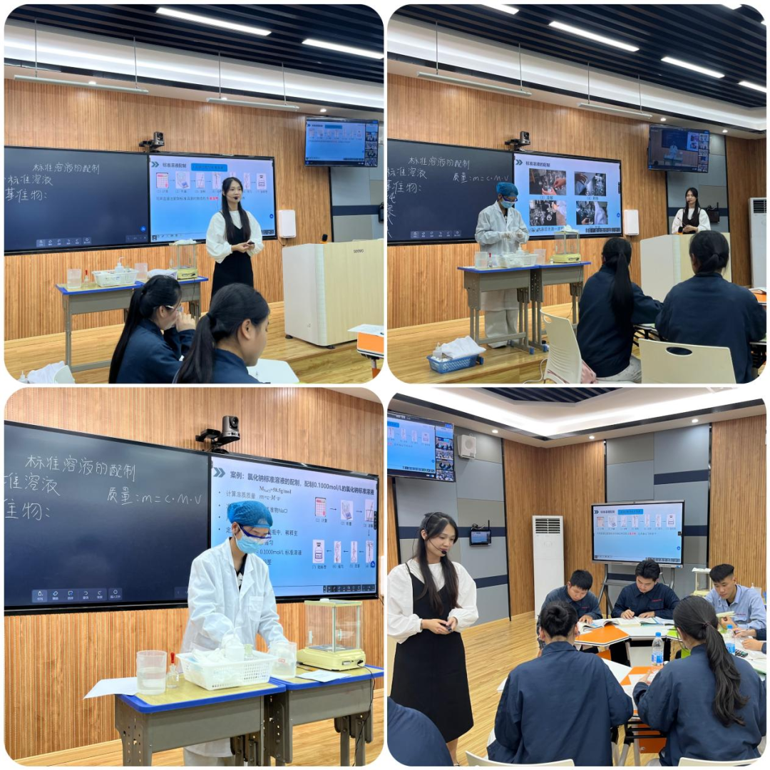 曾钊老师以培养学生化学实验严谨性与精准操作素养为出发点,用扎实的标准溶液配制专业知识对学生进行循循善诱,给予学生自主探索实验步骤的空间,让学生在实操演练中掌握标准溶液配制的核心技能。在系统传授标准溶液配制原理、操作流程及基准物特性等知识的同时,曾钊老师更将严谨意识融入教学全过程,带领学生真切体会到化学实验“差之毫厘,谬以千里”的严谨本质,深刻领悟规范操作对于实验精准性的关键价值。