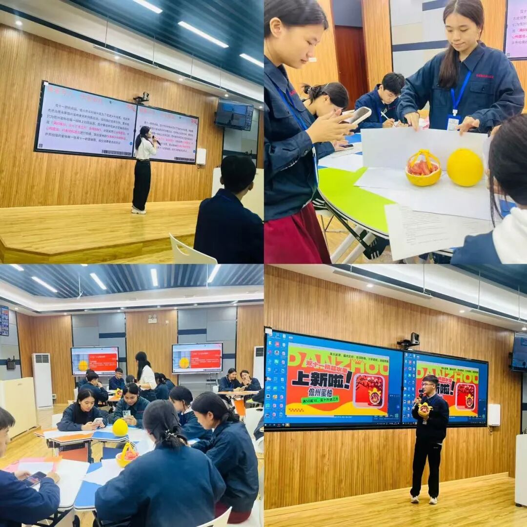 吴燕萍老师以双十一助农销售为任务驱动,讲授商品拍摄的三分、中心、对角线三种构图法。吴老师先解密各构图技法要点,再引导学生结合儋州蜜柚的形态特征,针对性拍摄突出其饱满多汁与新鲜感的商品图,并融入满减、买赠等促销信息。课后通过成果展示与互动评价,让学生明确不同构图的优势,既掌握实操技能,又增强了家乡文化认同感。