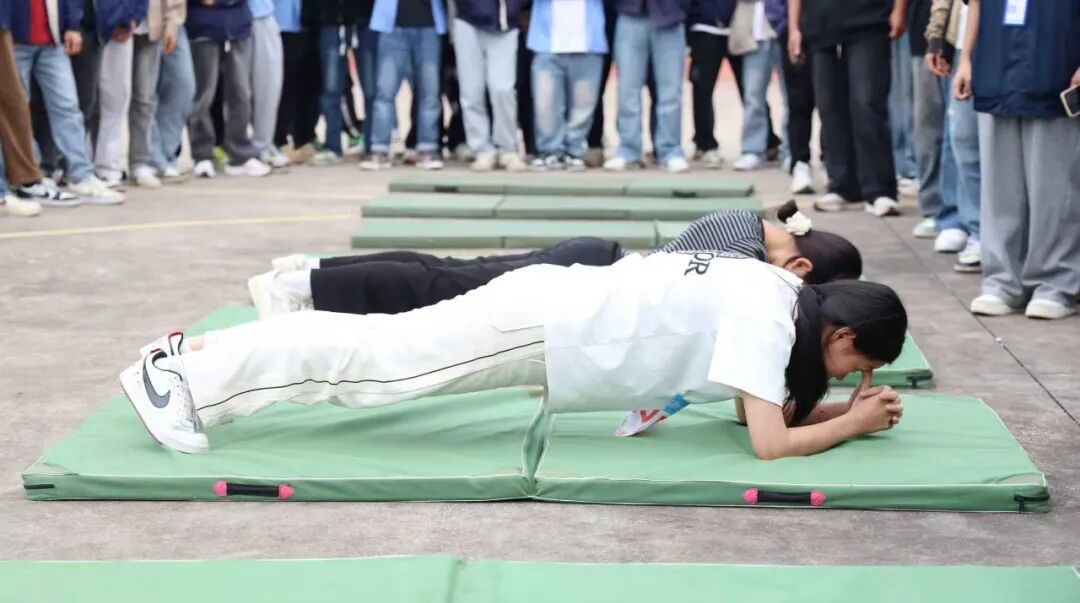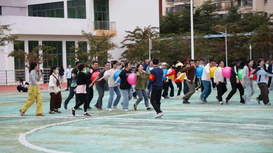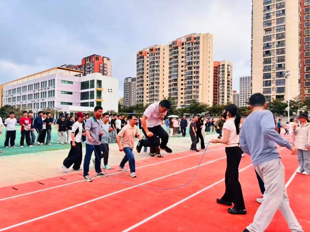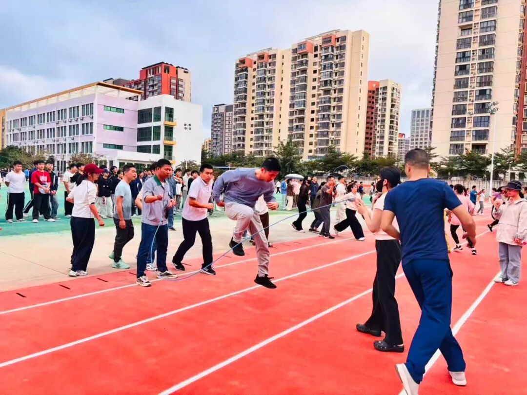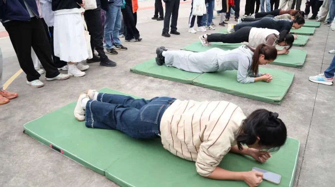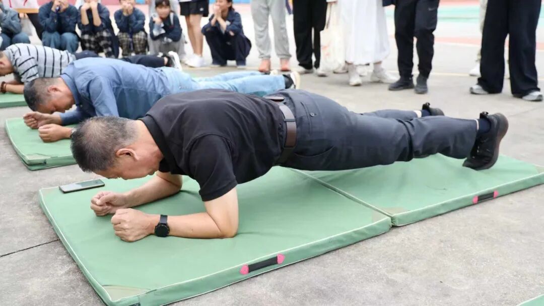 趣味运动赛场向来是“快乐源泉”,笑点与燃点双向拉满!套上彩色布袋的师生们化身灵活“小袋鼠”,蹦跳疾驰间尽显憨态与韧劲;8人跳大绳现场,摇绳者双臂翻飞如飞轮,跳绳者默契衔接、鱼贯而入;6人夹球跑队员肩并肩、手挽手,口号铿锵同步伐整齐;平板支撑赛场秒变“耐力战场”,师生们身姿挺拔如松,汗水浸湿衣衫仍咬牙坚持;单杠挑战中,健儿纵身一跃握杆发力,每一次突破都赢得阵阵喝彩。