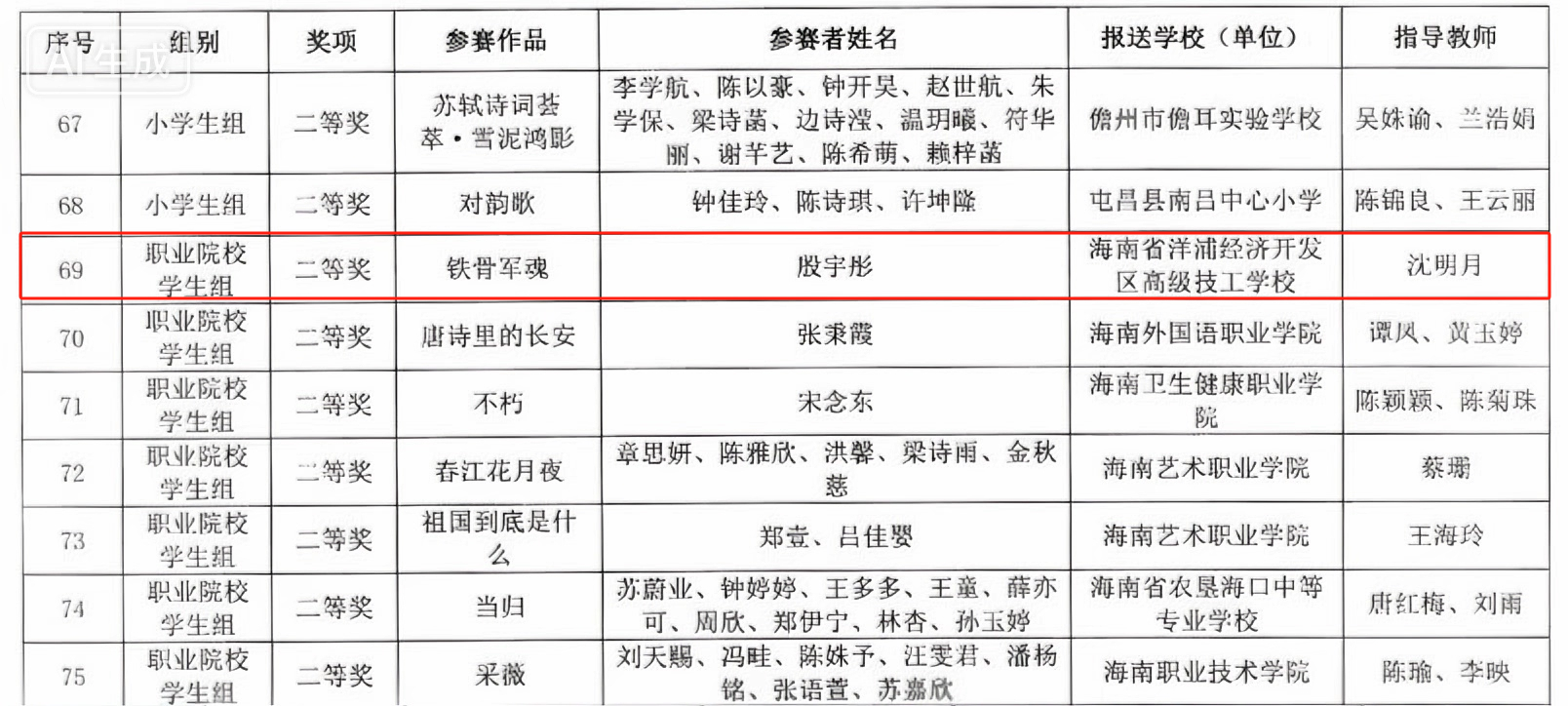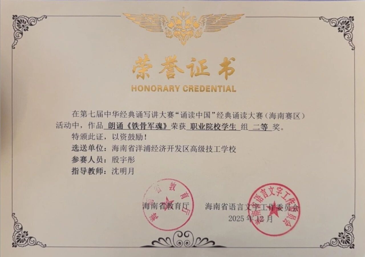捷报频传!在第七届中华经典颂写讲大赛(海南赛区)的舞台上,我校学子殷宇彤凭借出色表现,大放异彩,在沈明月老师的专业指导下,凭借作品《铁骨军魂》一路过关斩将,斩获职业院校学生组二等奖!