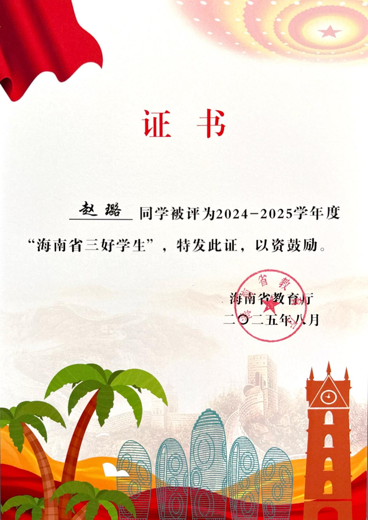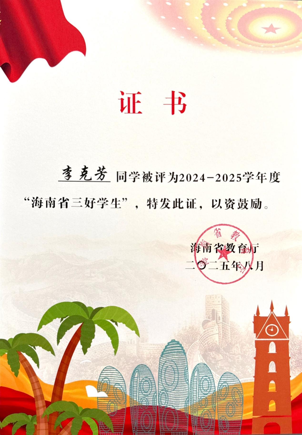22级物流2班赵璐同学、21级机电1班李克芳同学、22级机械1班李守邦同学荣获“海南省三好学生”称号。