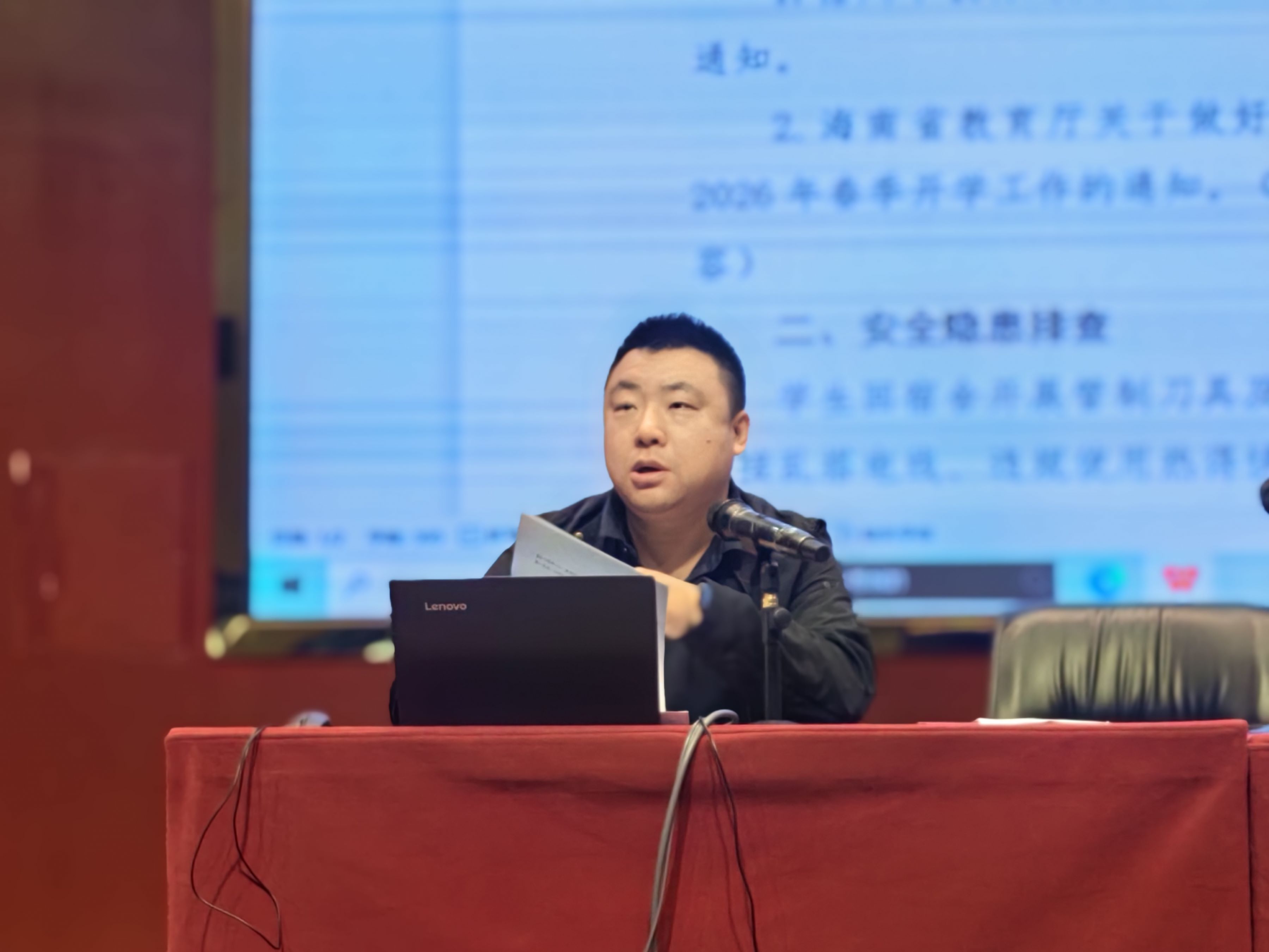 会上,曹帅主任首先带领全体参会人员集中学习并传达《儋州市教育局关于做好2026年寒假学校安全工作的通知》、《海南省教育厅关于做好中等职业学校寒假放假及2026年春季开学工作的通知》两份重要文件精神。会议明确要求,要始终绷紧安全之弦,牢固树立“安全第一、预防为主”的理念,以问题为导向,全面开展校园安全隐患排查整治工作。此外,会议特别强调要创新开展防溺水安全教育,结合“万师访万家”活动,推动家校协同,切实督促家长履行假期监护责任,形成安全防护合力。