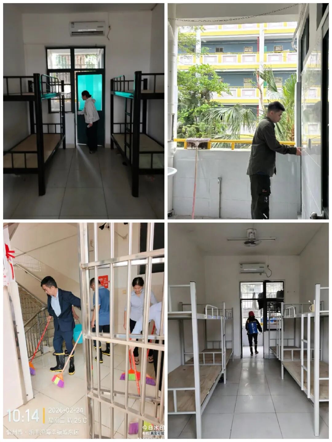良好的宿舍环境是学生安心生活、专注学习、和谐相处的重要基础。学校相关部门对学生宿舍的消防、用电、门窗等方面进行全面检查,严查违规电器与杂物堆放。同时,后勤部门对宿舍走廊、卫生间、床铺、储物柜等区域进行全方位清扫、消毒,营造安全整洁、卫生舒适的住宿环境。