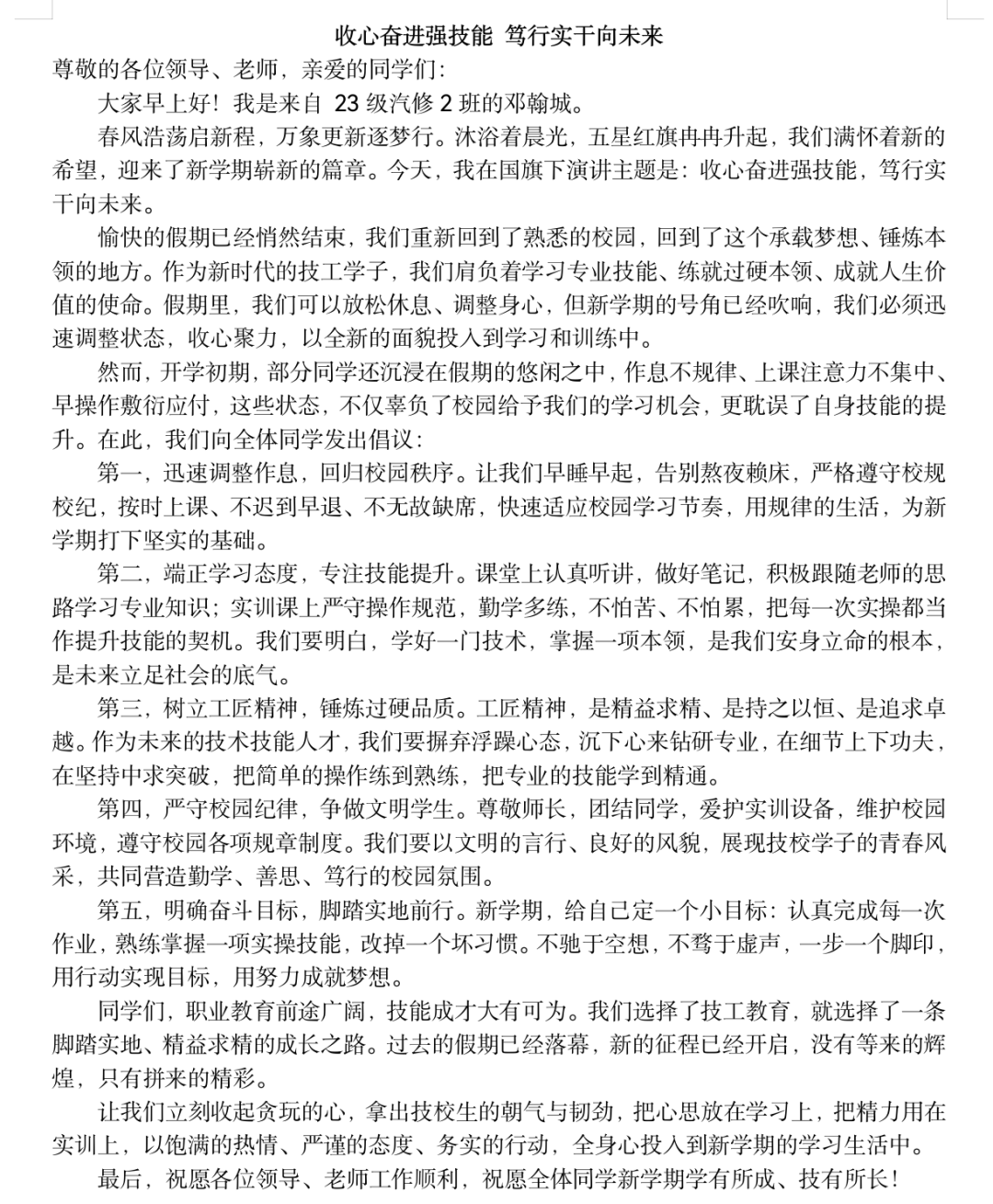 升旗仪式后,23汽修2班邓翰城同学做国旗下演讲。他结合自身专业学习与校园成长经历,号召同学们迅速收心归位、摒弃懈怠,立足课堂与实训深耕技能,以严谨态度钻研技艺、以实干精神践行初心,将青春理想融入技能成长,以精技笃行不负美好韶华,用过硬本领书写青春答卷。演讲真挚恳切、铿锵有力,赢得全场热烈掌声。