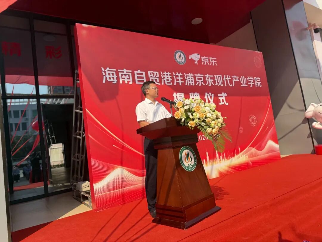 洋浦经济开发区高级技工学校党支部书记、校长国志宏致辞。国校长代表学校向各位领导、嘉宾表示诚挚欢迎和衷心感谢。他表示,成立京东现代产业学院,是学校紧扣海南自贸港建设、服务儋洋一体化发展的重要举措,也是深化产教融合、推进校企协同育人的关键实践。学校将以产业学院为新平台,紧密对接现代物流、数字经济等产业需求,优化专业建设,创新育人模式,推动校企资源共享、优势互补。同时坚守立德树人、技能育人根本任务,着力培养高素质技术技能人才,努力将产业学院打造成区域产教融合示范标杆,为地方经济发展和自贸港建设贡献职教力量。