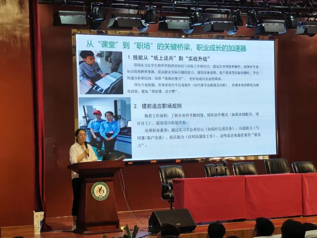 会上,张老师深入解读当前产业发展趋势:当前新兴产业迭代加速、传统行业转型升级,低技能岗位逐步被替代,适配新质生产力发展的复合型技能人才缺口持续扩大。她强调,企业核心看重实操能力与综合素养,希望同学们既要深耕专业技能,也要夯实文化基础,全面提升复合竞争力。同时明确要求,全体学生须严格按照规定完成一年顶岗实习任务,保质保量完成实践学习。