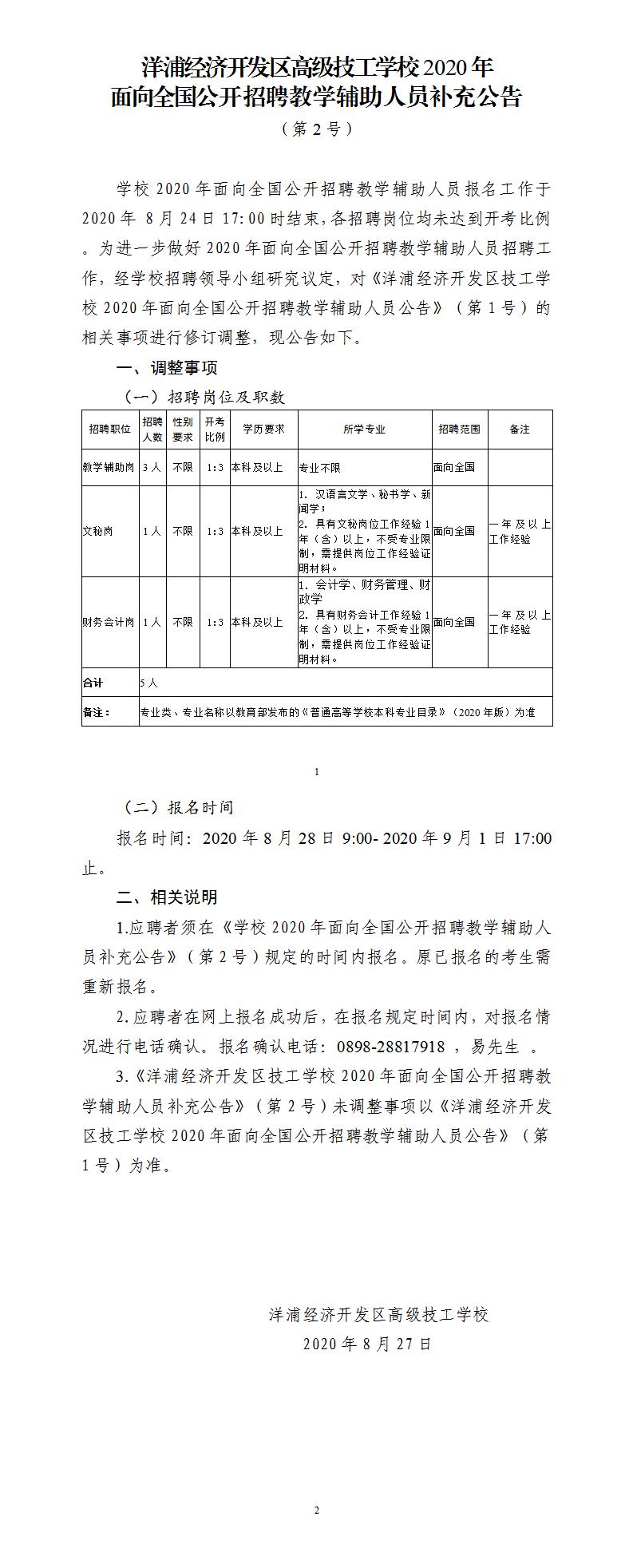 洋浦经济开发区技工学校2020年面向全国公开招聘教学辅助人员补充公告(第2号)