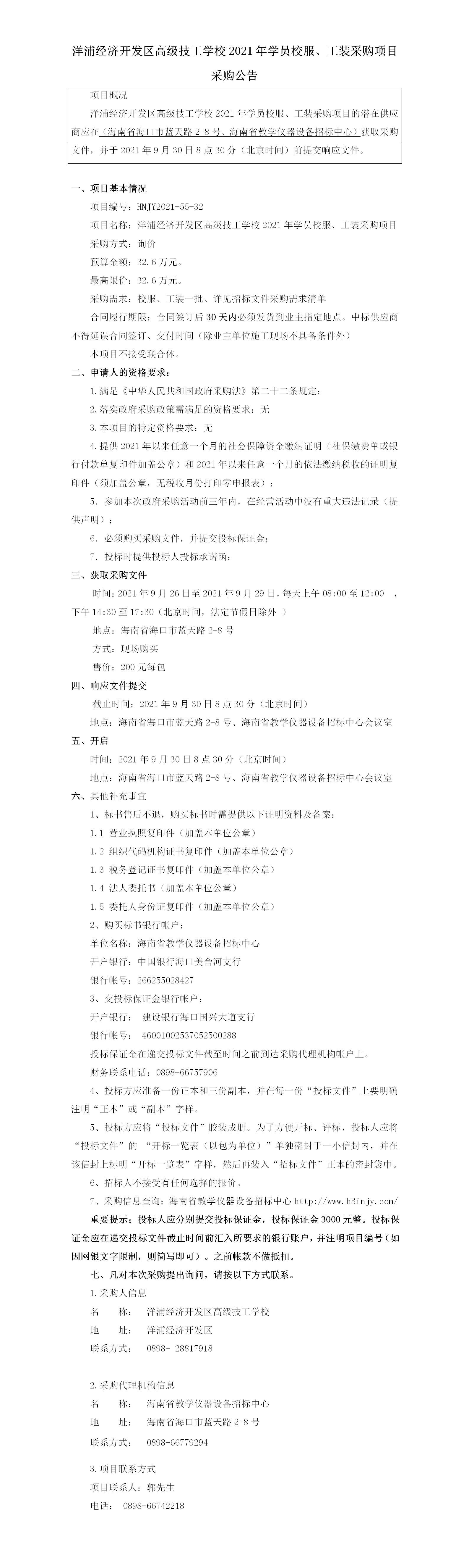 洋浦经济开发区高级技工学校2021年学员校服、工装采购项目采购公告