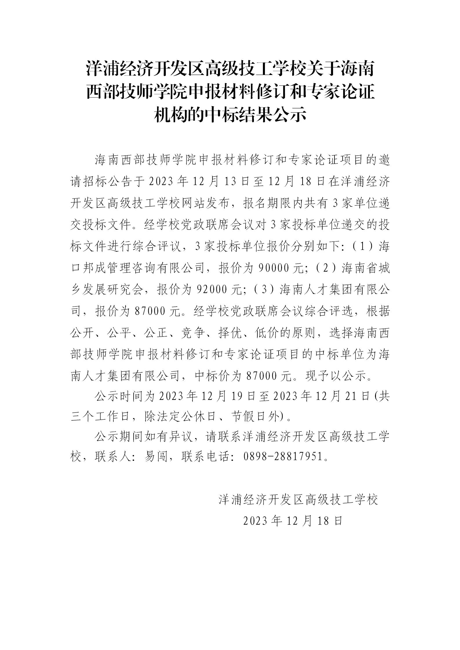 海南西部技师学院申报材料修订和专家论证机构的中标结果公示