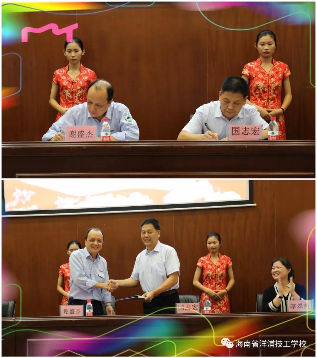 会议议程第四项:海南金光助学与环保基金会理事、海南金海浆纸业有限公司总经理室谢盛杰处长与国志宏校长共同签订2019-2025学年度金光奖学金协议。会场响起了热烈、持久的掌声。