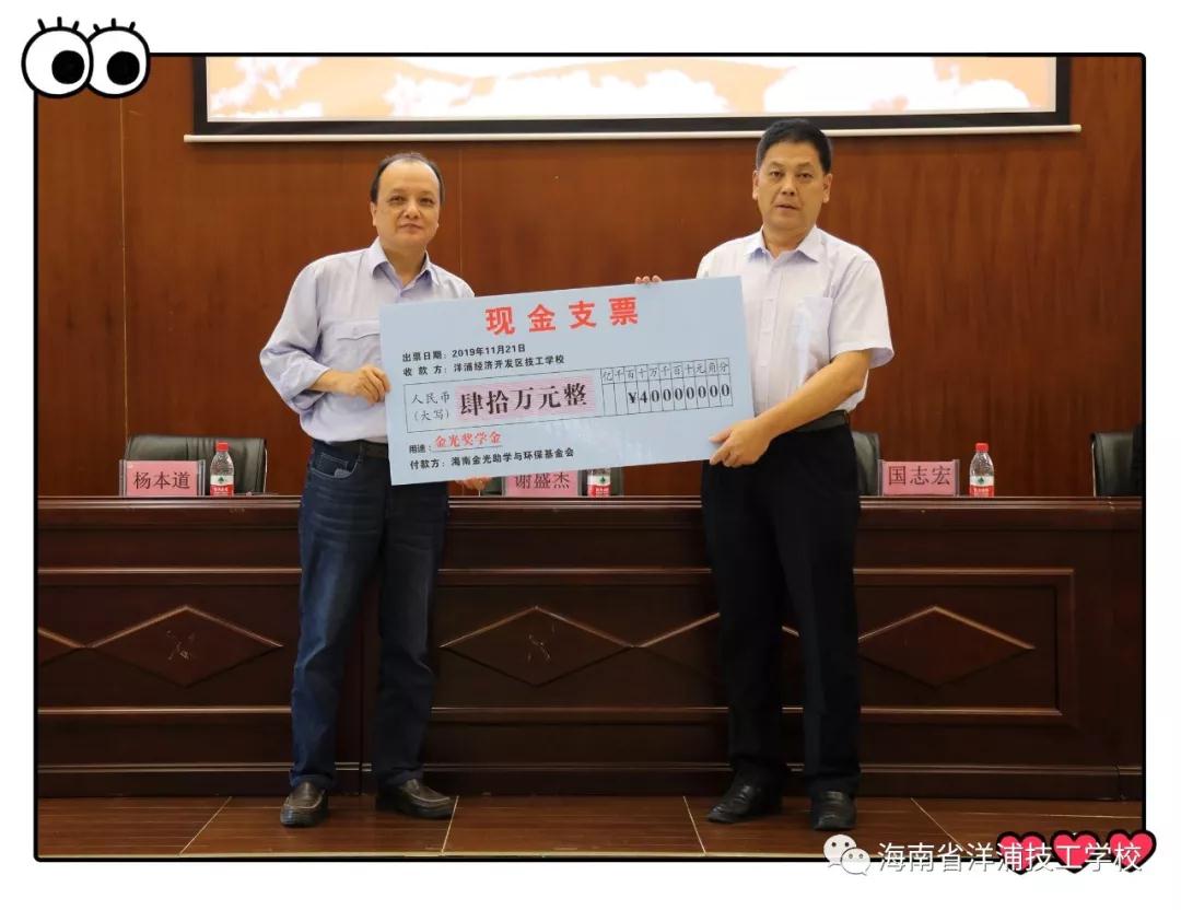 会议议程第五项:海南金光助学与环保基金会向洋浦技工学校授“金光奖学金”支票牌。