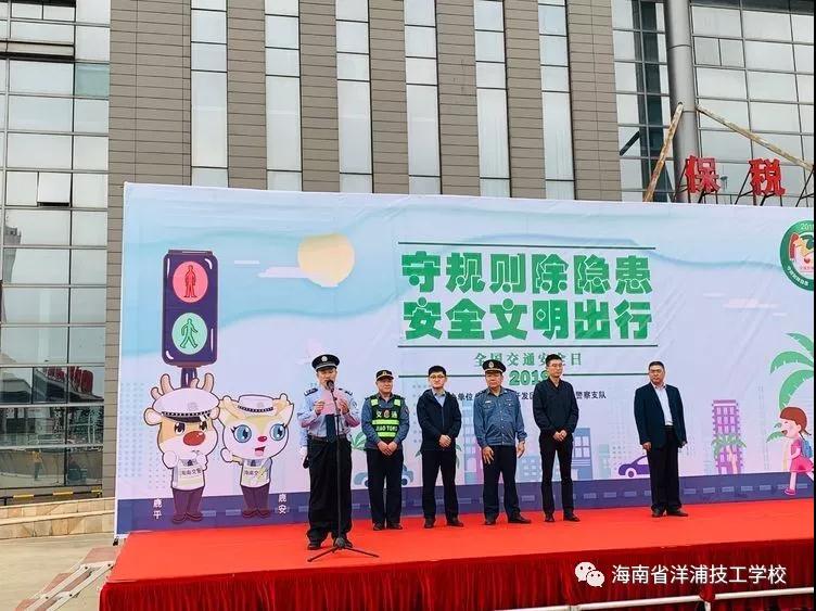 活动第二项:洋浦公交公司的代表、洋浦技工学校学生代表和交通指挥志愿者代表分别上台发言。我校学生代表王发杰同学上台倡议同学们遵守交通规则,提高安全意识,共建和谐平安校园。